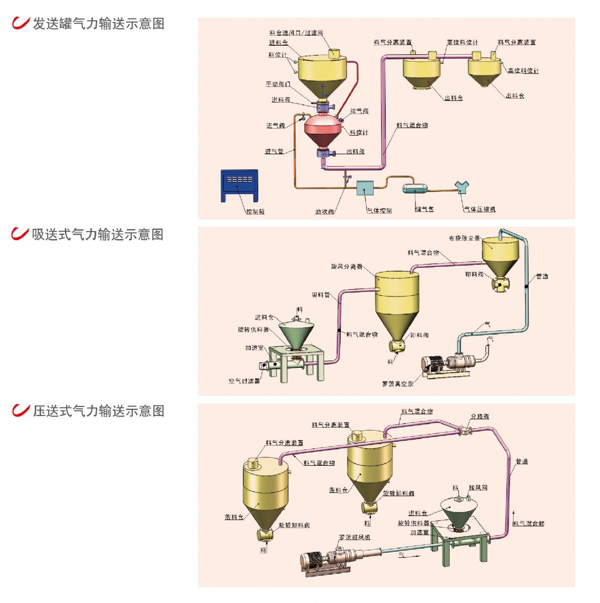 正壓和負壓也可進行組合應用以滿足特殊要求,比較適用于多點供料單點出料的輸送方式,通常為輸送粉狀、小顆?;虮戎剌^輕的物料。